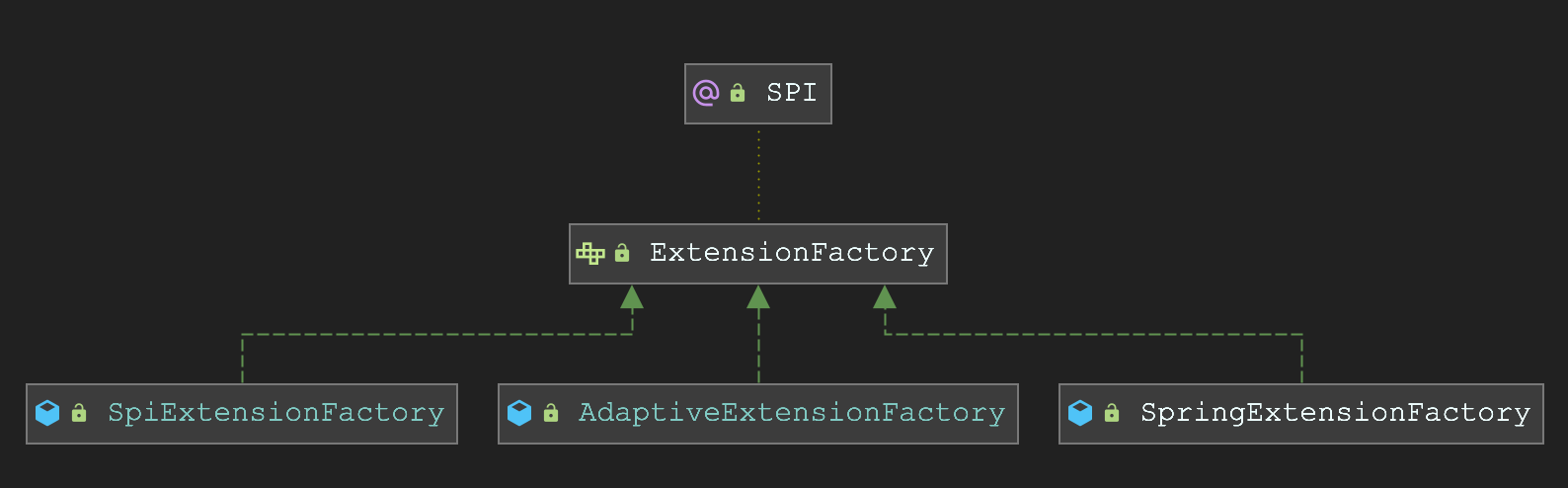 ExtensionFactory主要用于加载扩展的实现。本身也通过@SPI修饰@SPI public interface ExtensionFactory { <T> T getExtension(Class<T> type, String name); } -