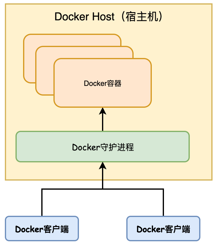 Docker是一个CS架构的程序。Docker客户端只需要向Docker服务器或者守护进程发出请求,服务器或守护进程将完成所有工作并返回结果