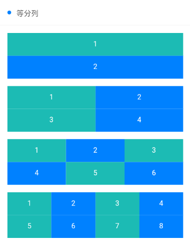 <view class="grid margin-bottom text-center" v-for="(item,index) in 5" :key="index" :class="'col-' + (index+1)"> <view class="padding" :class="indexs%2==0?'bg-cyan':'bg-blue'" v-for="(item,indexs) in (index+1)*2" :key="indexs"> {{indexs+1}} </view> </view>