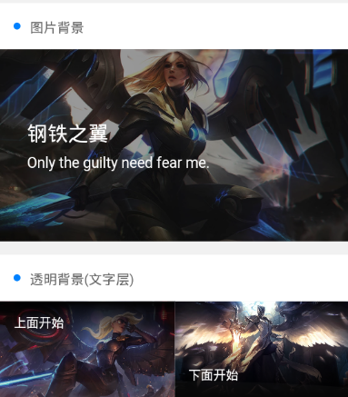<view class="bg-img bg-mask flex align-center" style="background-image: url('https://ossweb-img.qq.com/images/lol/web201310/skin/big10006.jpg');height: 414upx;"> <view class="padding-xl text-white"> <view class="padding-xs text-xxl text-bold"> 钢铁之翼 </view> <view class="padding-xs text-lg"> Only the guilty need fear me. </view> </view> </view>