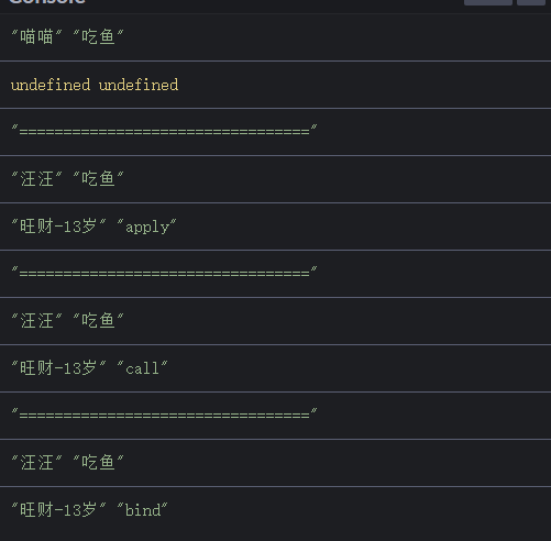 var cat = { name: "喵喵", eatFish: function (param1, param2) { console.log(this.name, "吃鱼"); console.log(param1, param2); } }; var dog = { name: "汪汪", eatBone: function (param1, param2) { console.log(this.name, "啃骨头"); console.log(param1, param2); } }; cat.eatFish(); console.log("================================="); cat.eatFish.apply(dog, ["旺财-13岁", "apply"]); console.log("================================="); cat.eatFish.call(dog, "旺财-13岁", "call"); console.log("================================="); cat.eatFish.bind(dog, "旺财-13岁", "bind")();