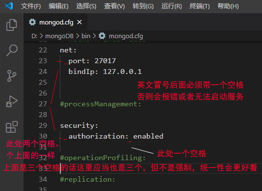 ① 打开配置文件,默认端口 port:27017 不安全,可以改成其他不冲突的端口号如 port:27027 ;