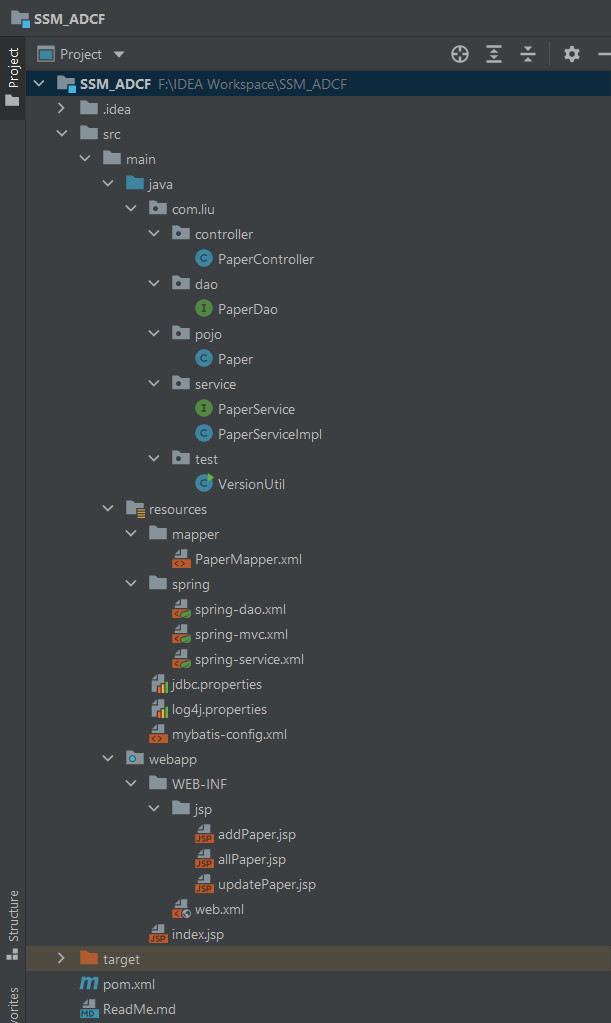 - pojo: 存放自定义的java类 如:paper类等,每个类的属性设为private,并提供public属性的getter/setter方法让外界访问.