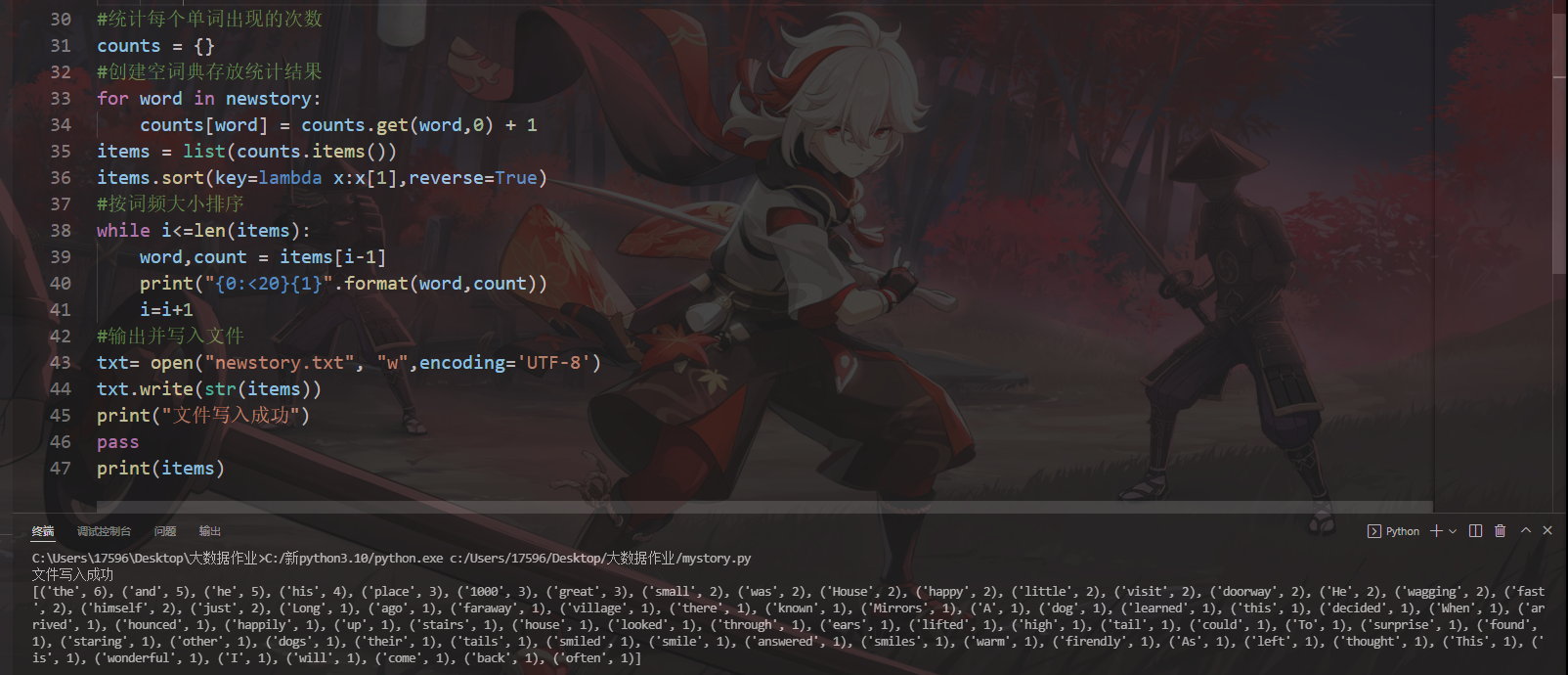 counts = {} #创建空词典存放统计结果 for word in newstory: counts[word] = counts.get(word,0) + 1 items = list(counts.items()) items.sort(key=lambda x:x[1],reverse=True)