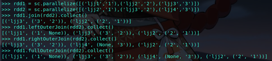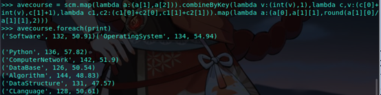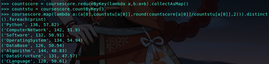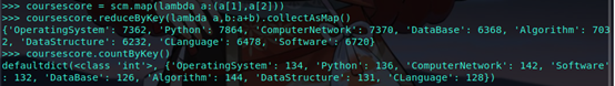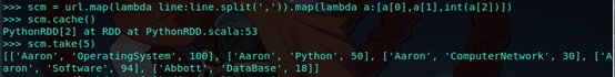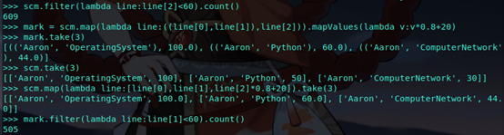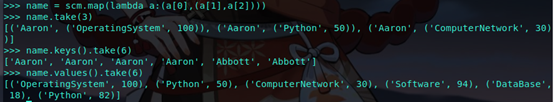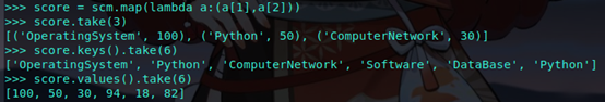 生成(姓名,课程分数)键值对RDD,观察keys(),values()