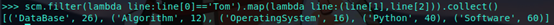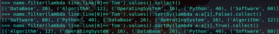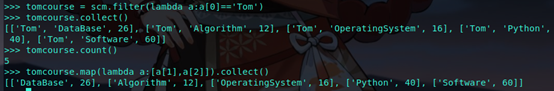 Tom选修了几门课?每门课多少分?filter(), map() RDD