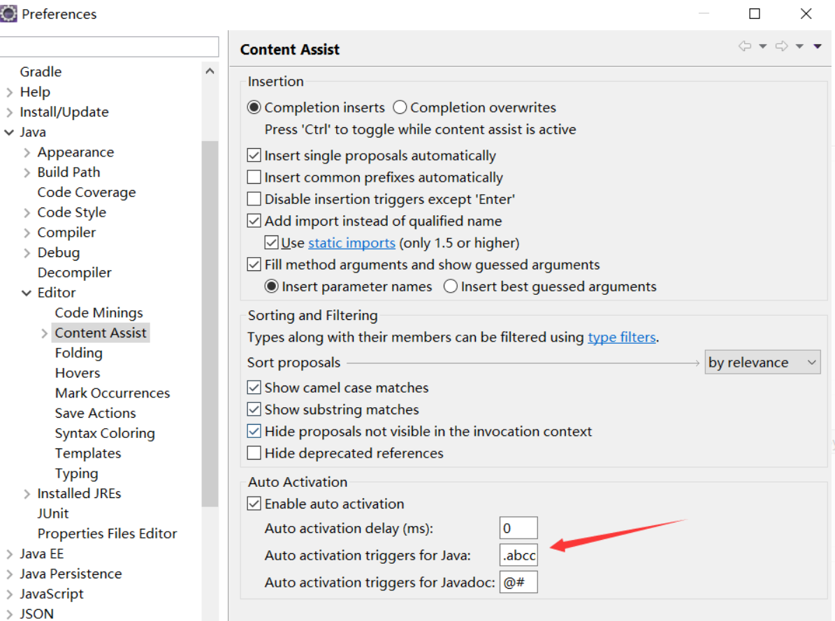 在【Auto activation triggers for Java】项输入 .qwertyuiopasdfghjklzxcvbnm