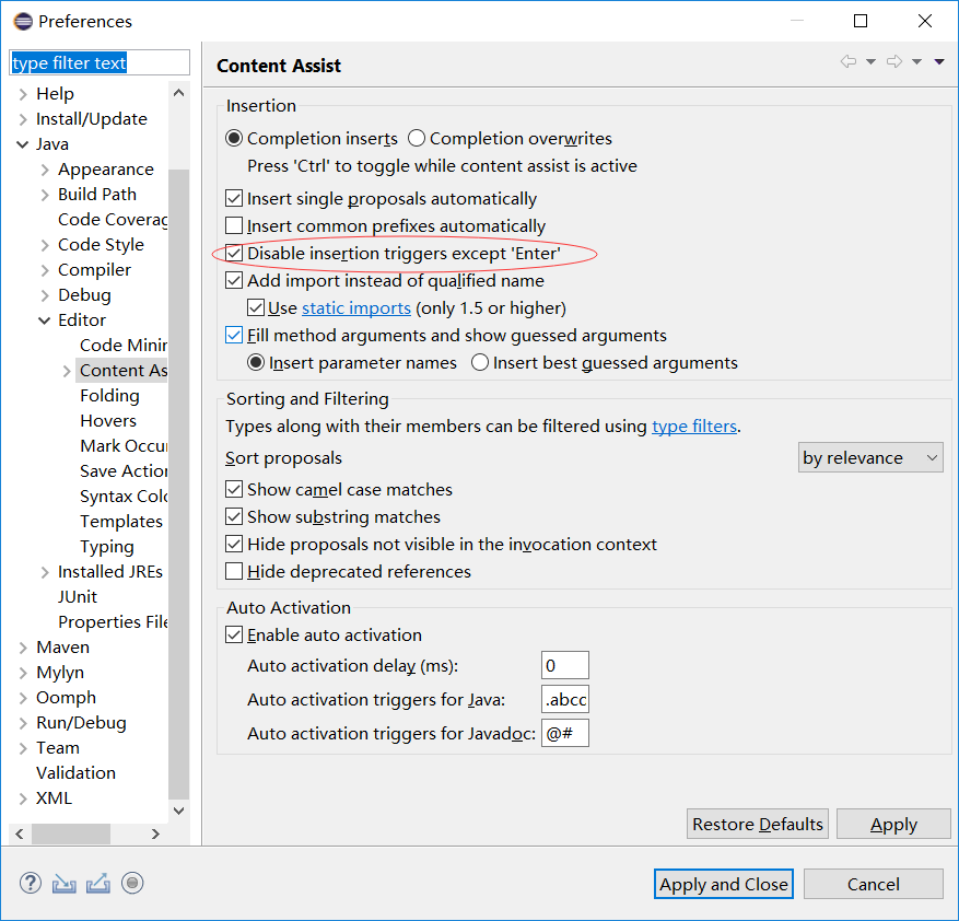 打开eclipse依次点击Window --> Perferences --> Java --> Editor --> Content Assist