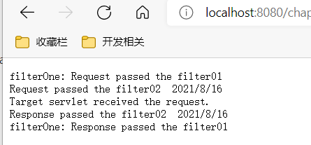 <servlet> <servlet-name>targetServlet</servlet-name> <servlet-class>idv.jarjack.chapter08.chainTest.targetServlet</servlet-class> </servlet> <servlet-mapping> <servlet-name>targetServlet</servlet-name> <url-pattern>/targetServlet</url-pattern> </servlet-mapping> <filter> <filter-name>filterOne</filter-name> <filter-class>idv.jarjack.chapter08.chainTest.filterOne</filter-class> </filter> <filter-mapping> <filter-name>filterOne</filter-name> <url-pattern>/targetServlet</url-pattern> </filter-mapping> <filter> <filter-name>filterTwo</filter-name> <filter-class>idv.jarjack.chapter08.chainTest.filterTwo</filter-class> <init-param> <param-name>date</param-name> <param-value>2021/8/16</param-value> </init-param> </filter> <filter-mapping> <filter-name>filterTwo</filter-name> <url-pattern>/targetServlet</url-pattern> </filter-mapping> -