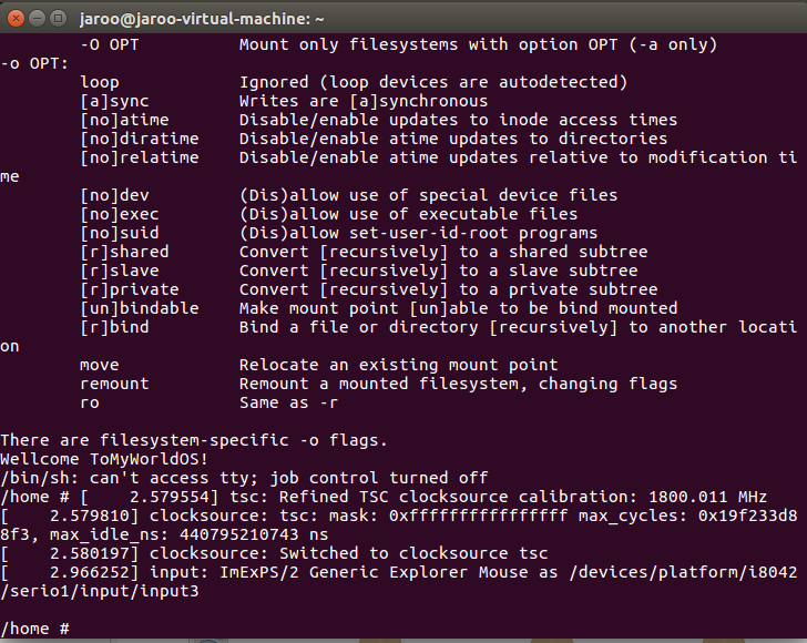 #!/bin/sh mount -t proc none /proc mount -t sysfs none /sys echo "Wellcome ToMyWorldOS!" cd home /bin/sh