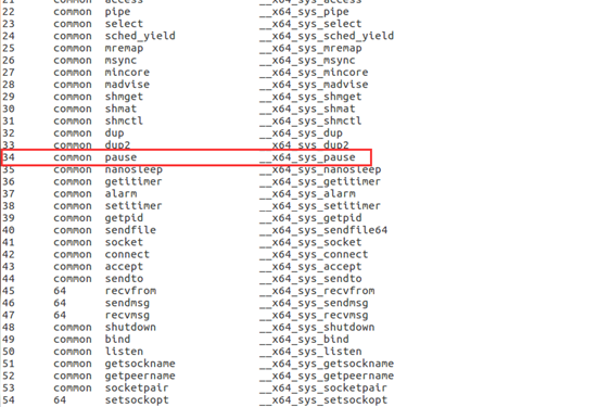 可以看到,34号对应的系统调用为pause,内核处理函数是__x64_sys_pause。