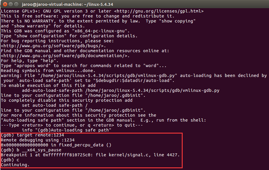 设置断点__x64_sys_pause,连接到1234端口,并继续让内核继续运行: