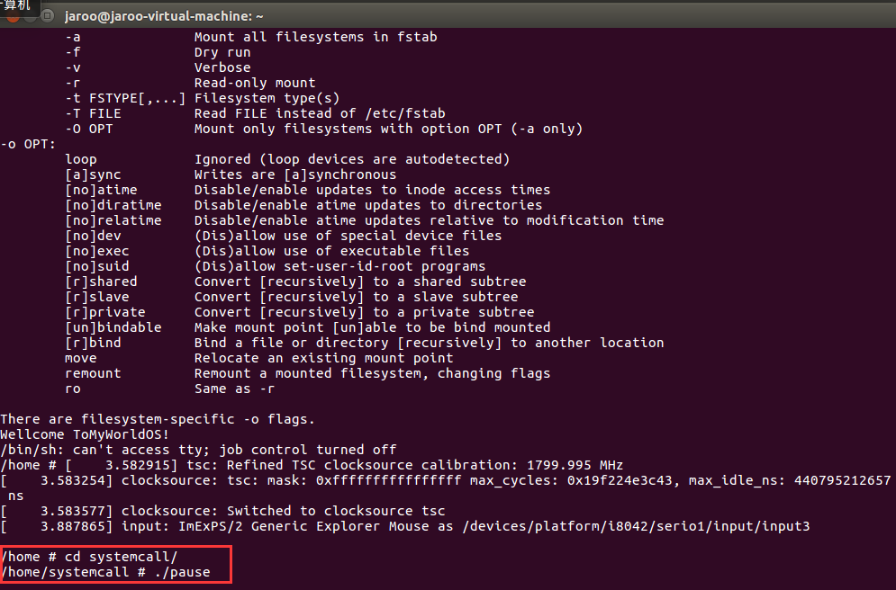 待内核初始化完成,进入根文件系统的目录/home/syscall下,执行pause