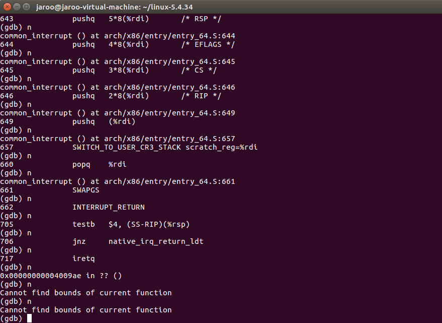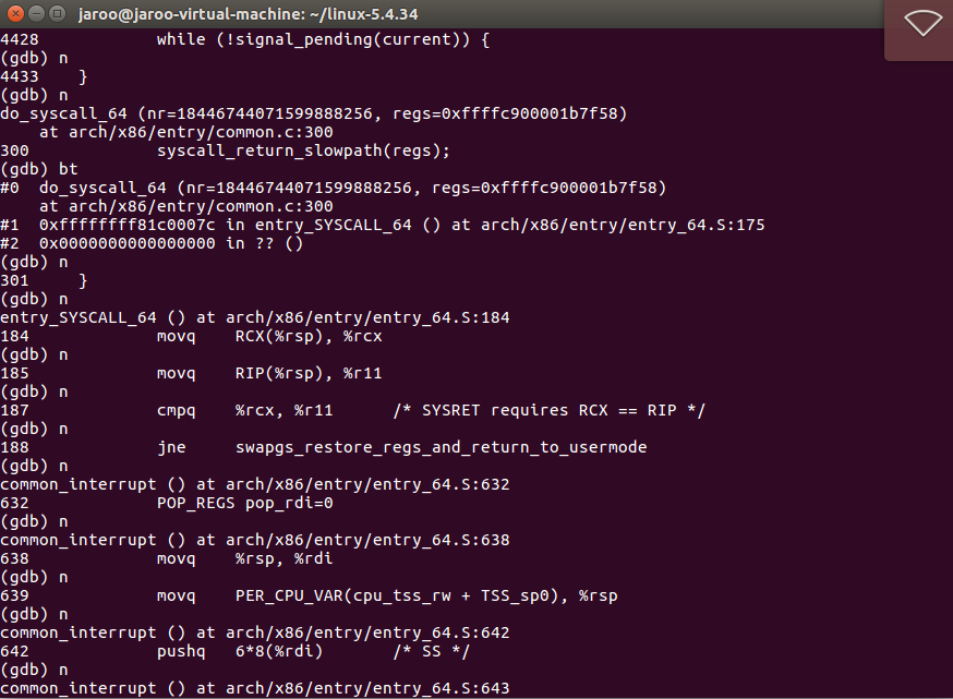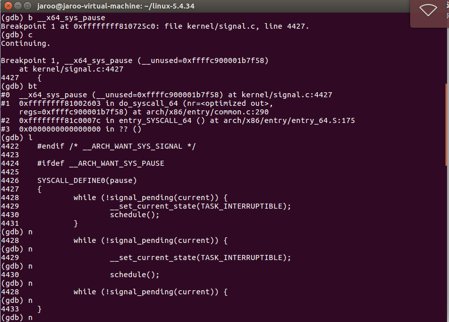 从上图可以看到,在执行pause程序时,确实停在了断点1:__x64_sys_pause处,输入bt查看堆栈情况,可以看到在执行到__x64_sys_pause时,栈中保留了三个函数的上下文,分别为__x64_sys_pause、do_syscall_64、entry_SYSCALL_64。值得注意的是,在单步执行到schedule函数时,gdb命令行明显等待了一会。我认为这里是发生了进程调度切换,当前进程主动释放掉CPU资源进入睡眠,当alarm发出信号时,发生中断,唤醒当前进程。所以,大约等待了3s,gdb才重新刷新。