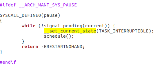 首先,系统调用pause真正调用的核心部分很简单,只有几行,如下: