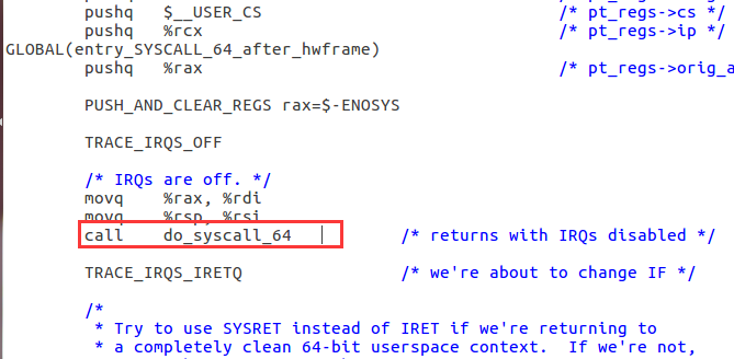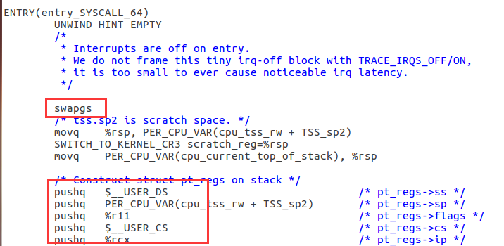 - 用户态的程序触发了系统调用,进入内核态,通过MSR寄存器找到中断函数入口,程序执行到entry_SYSCALL_64,在entry_SYSCALL_64中,主要保存进程现场
