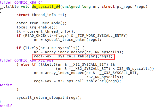 2. 执行do_syscall_64函数,通过syscalltable得到系统调用号,去执行具体的系统调用内核处理函数。