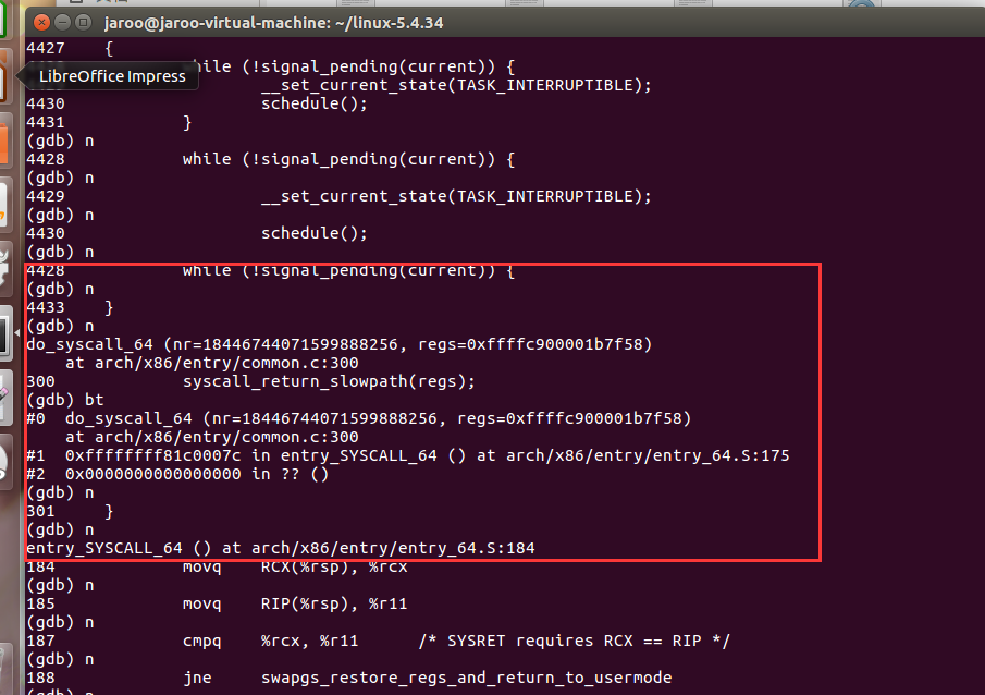 另外,需要理清整个系统调用的执行过程。从断点处的调用栈可以看到,先调用了entry_SYSCALL_64,然后调用了do_syscall_64,最后才是具体的系统调用函数__x64_sys_pause。