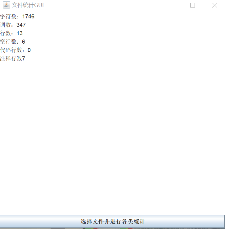 ⑥图形化界面:新建一个window类,选择相关命令时new该类,同时调用其中方法创建JFame以及一个JButton,一个textArea,其中JButton中添加一个监听器,选择后调用JFileChooser()类获取文件,同时调用上面写好的方法,把结果在textArea中输出。