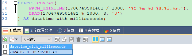 CONCAT(...)这部分将FROM_UNIXTIME函数的结果和LPAD函数的结果连接起来,创建一个完整的日期时间字符串,包括毫秒。 -
