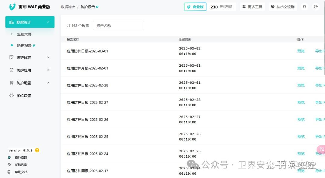 本案例旨在展示雷池个人版在真实环境下的防护能力。选择了一款我们自研的通用报告生成器作为测试对象,该生成器目前处于开发初期,尚未正式上线(上线即免费),存在部分已知漏洞。我们利用雷池对该平台进行安全防护,并成功抵御了模拟的DDoS攻击、漏洞利用、API Fuzz等攻击,充分验证了雷池在应对各类网络攻击方面的有效性。