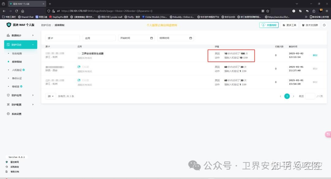 为了验证雷池的防护能力,我模拟了一次简单的 SQL 注入探测攻击,用瞎SQL跑了三条 API 接口。得益于雷池精准的攻击识别机制,在触发 10 次攻击后,该 IP 地址被成功封禁。此次测试结果表明,雷池能够有效抵御各种类型的攻击,包括看似简单的探测行为。