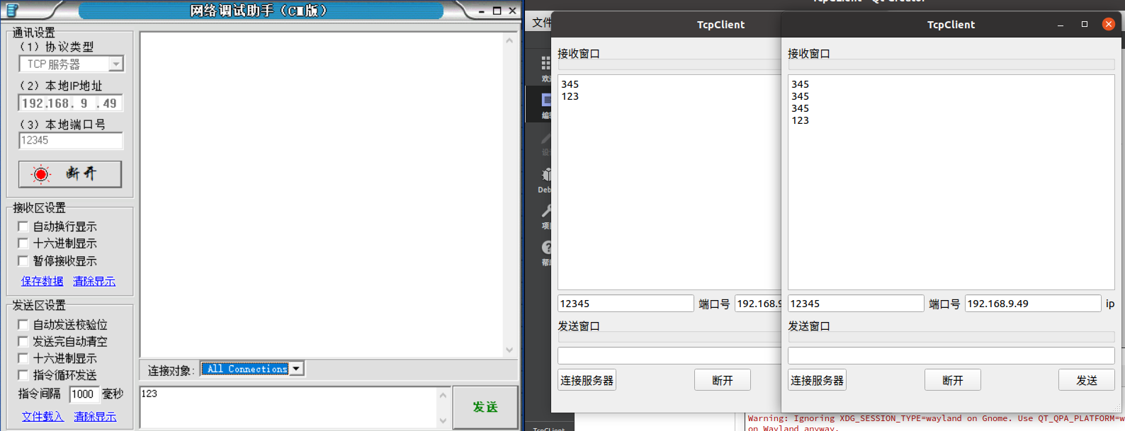UBUNTU 20.04下QT5写的一个客户端程序,左边为服务器程序,右边为客户端。