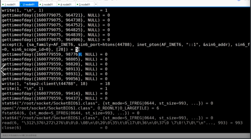strace -ff -o out /usr/java/j2sdk1.4.2_19/bin/javac SocketBIO
