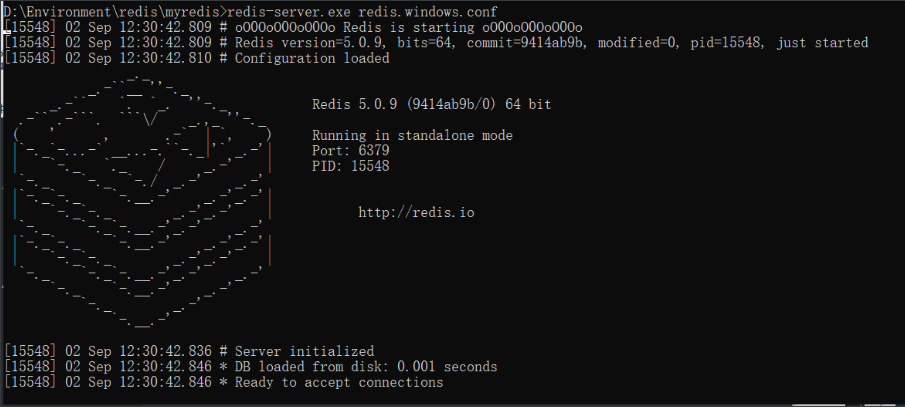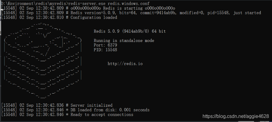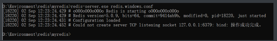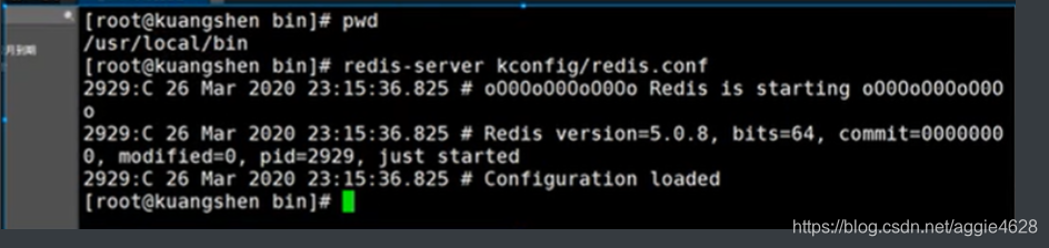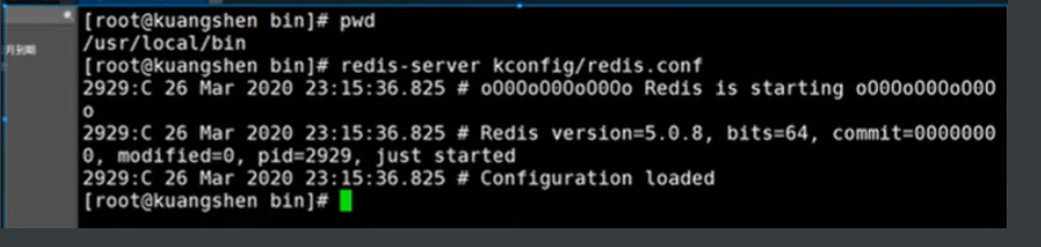3.启动服务 redis-server myredisconfig/redis.conf 服务名+配置文件 在bin 目录下 redis-server redis.conf