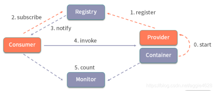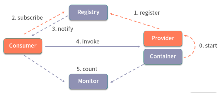 Dubbo 是还蛮火的RPC框架,消费者服务者模式。与rest可以跨语言调用不同,Dubbo只限于两者都是JAVA调用。下图为基本框架图。