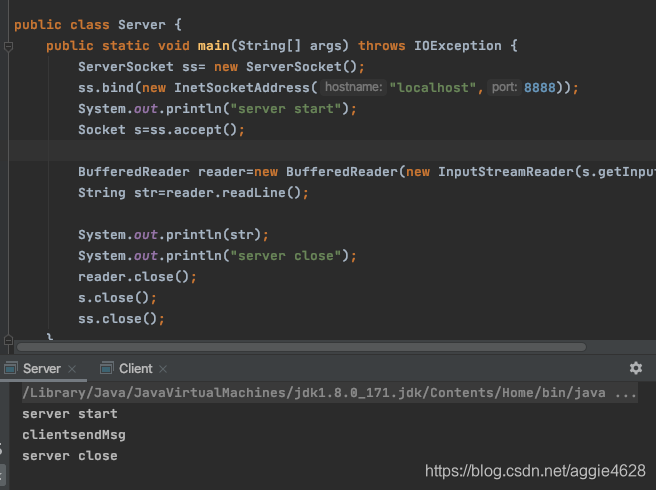 运行的结果:Server 在 接收到client之前一直阻塞在那。