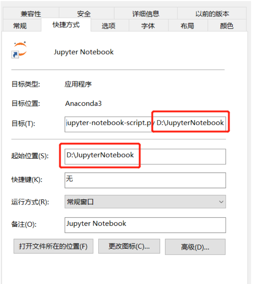2.3 打开 jupyterNotebook.exe属性页,修改其路径