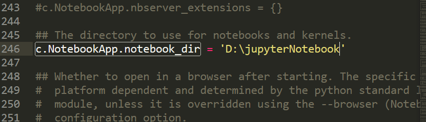 windwos:c.NotebookApp.notebook_dir = 'd:\jupyterNotebook' 。必须全英文。