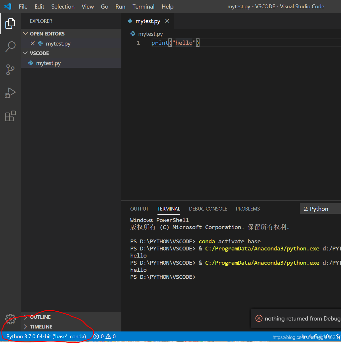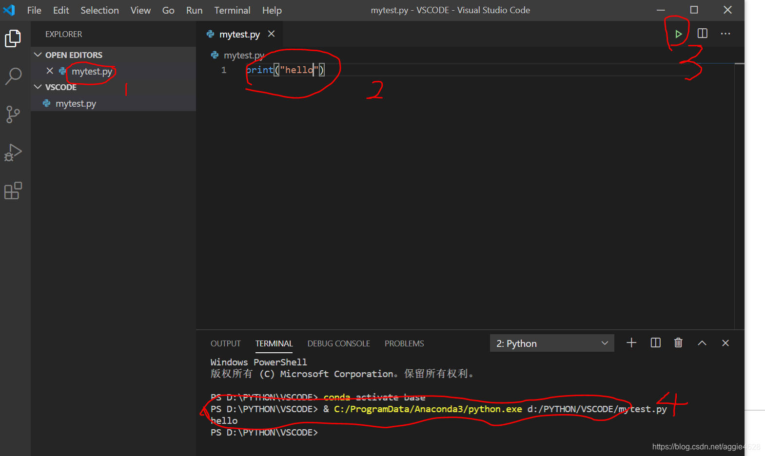 4.在文件夹下新建一个mytest.py文件1->2写两行代码->3点击运行一下->4下方输出。