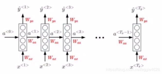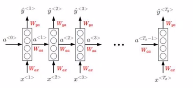 训练三个参数:Wax Waa Wya 每个时刻三个参数共享的。