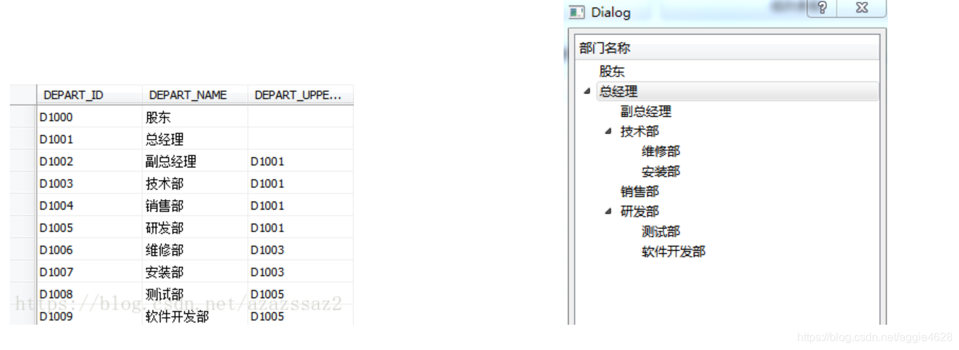 实际中,我们经常要求点击按钮,读取数据库中的某张表,用树形结构显示表中的数据关系。就是按左边数据查询内容生成右边的表。比如: