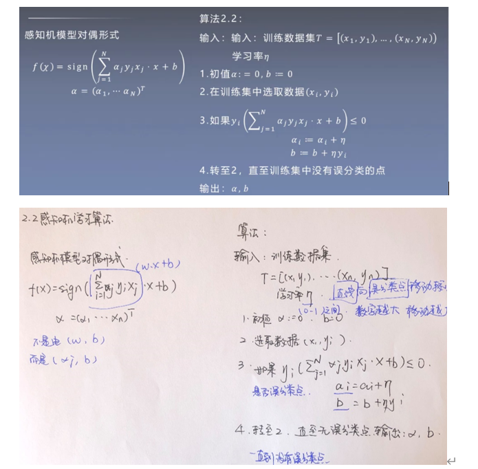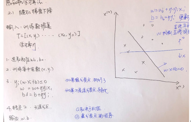 3.感知机算法 (两种,后一种计算量小 原因1.先算内积,2更新的是数不是向量。前一种更新的是向量。)