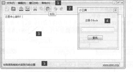 1.菜单栏 2.工具栏 3.中心部件 4.DOCK部件 5.状态栏