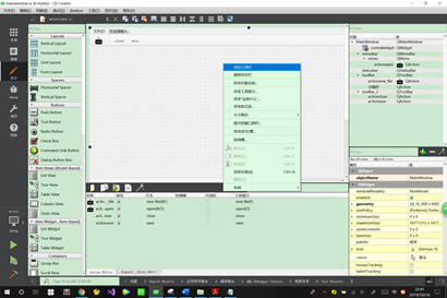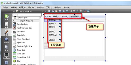 需要先创建mainWindow设计师类,然后就可以进行设计了,这里选择直接设计ui文件,下拉菜单无法直接输入中文,需要拷贝过来。