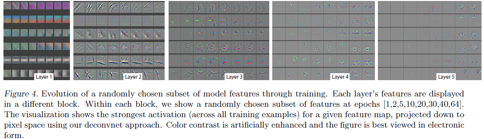 上图展示了各层特征在训练步骤增加时激活值对应特征变化情况;一个比较有意思的现象是底层的卷积最先收敛,高层的特征需要在充分训练后才能收敛。这个和深度网络的梯度弥散现象正好相反,说明ReLU这中非线性函数能够很好的传递误差梯度。这种底层先收敛,高层后收敛比较符合人的直观。