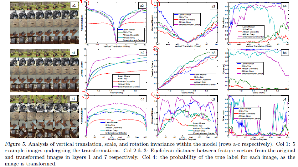 2,从每行对比中,发现卷积对于平移和缩放的不变形更好,对于旋转的不变性较差。高层对于平移的尺度,缩放的倍数与特征改变量成线性增长;对于旋转变换,随着旋转角度的变化,促增长较大外,规律性并不明显。