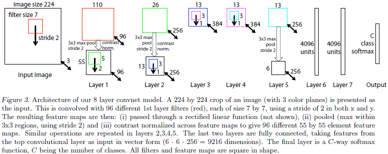 Input(224,224,3)→96F(7,7,3,2)→LRN→max-p(3,3,2)→256F(5,5,96,2)→LRN→max-p(3,3,2)→384F(3,3,256,1)→384F(3,3,384,1)→256F(3,3,384,1)→max-p(3,3,2)→4096fc→4096fc→softmax