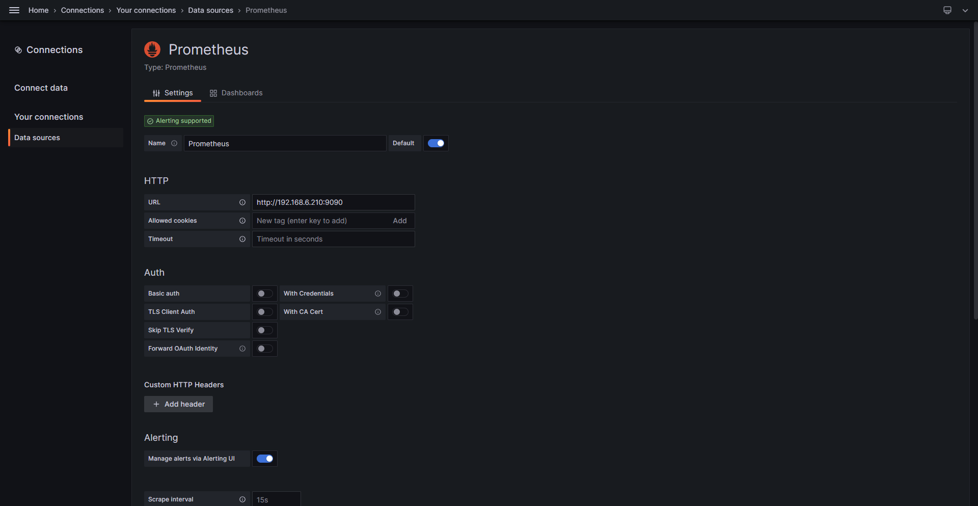 # my global config global: scrape_interval: 15s # Set the scrape interval to every 15 seconds. Default is every 1 minute. evaluation_interval: 15s # Evaluate rules every 15 seconds. The default is every 1 minute. # scrape_timeout is set to the global default (10s). # Alertmanager configuration alerting: alertmanagers: - static_configs: - targets: # - alertmanager:9093 # Load rules once and periodically evaluate them according to the global 'evaluation_interval'. rule_files: # - "first_rules.yml" # - "second_rules.yml" # A scrape configuration containing exactly one endpoint to scrape: # Here it's Prometheus itself. scrape_configs: # The job name is added as a label `job=<job_name>` to any timeseries scraped from this config. - job_name: 'prometheus' # metrics_path defaults to '/metrics' # scheme defaults to 'http'. static_configs: - targets: ['192.168.6.9:9090']