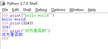 >>> print("hello world!") hello world! >>> print(3243) 3243 >>> print("对方是否的") 对方是否的
