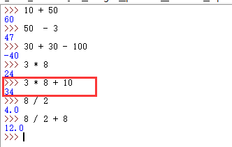 >>> 10 + 50 60 >>> 50 - 3 47 >>> 30 + 30 - 100 -40 >>> 3 * 8 24 >>> 3 * 8 + 10 34 >>> 8 / 2 4.0 >>> 8 / 2 + 8 12.0