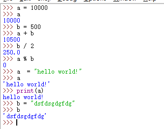 >>> a = 10000 >>> a 10000 >>> b = 500 >>> a + b 10500 >>> b / 2 250.0 >>> a % b 0 >>> a = "hello world!" >>> a 'hello world!' >>> print(a) hello world! >>> b = "dsfdsgdgfdg" >>> b 'dsfdsgdgfdg'
