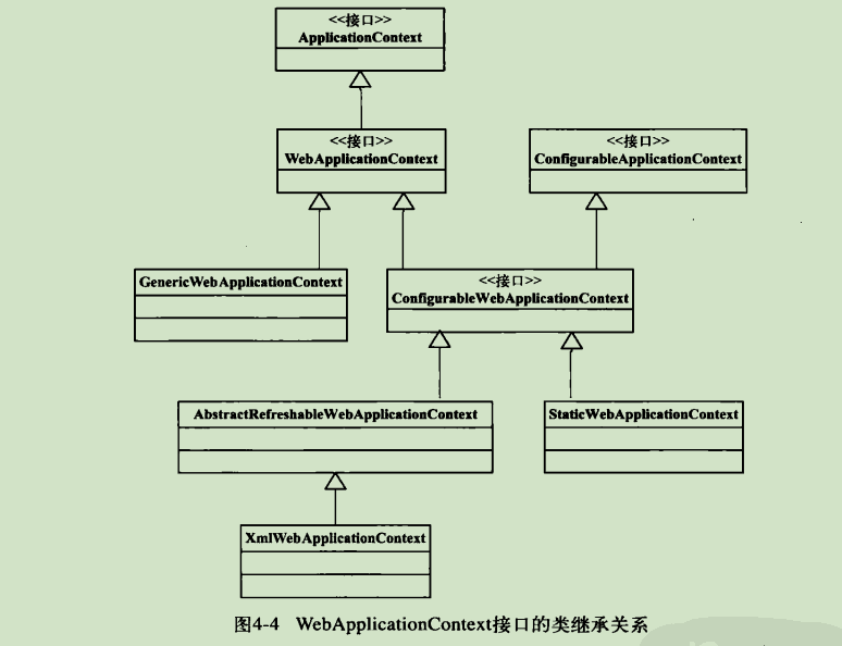 在初始化方法中调用ContextLoader提供的initWebApplicationContext方法来初始化 Web 环境下的spring 容器WebApplicationContext,WebApplicationContext的类层次关系如下