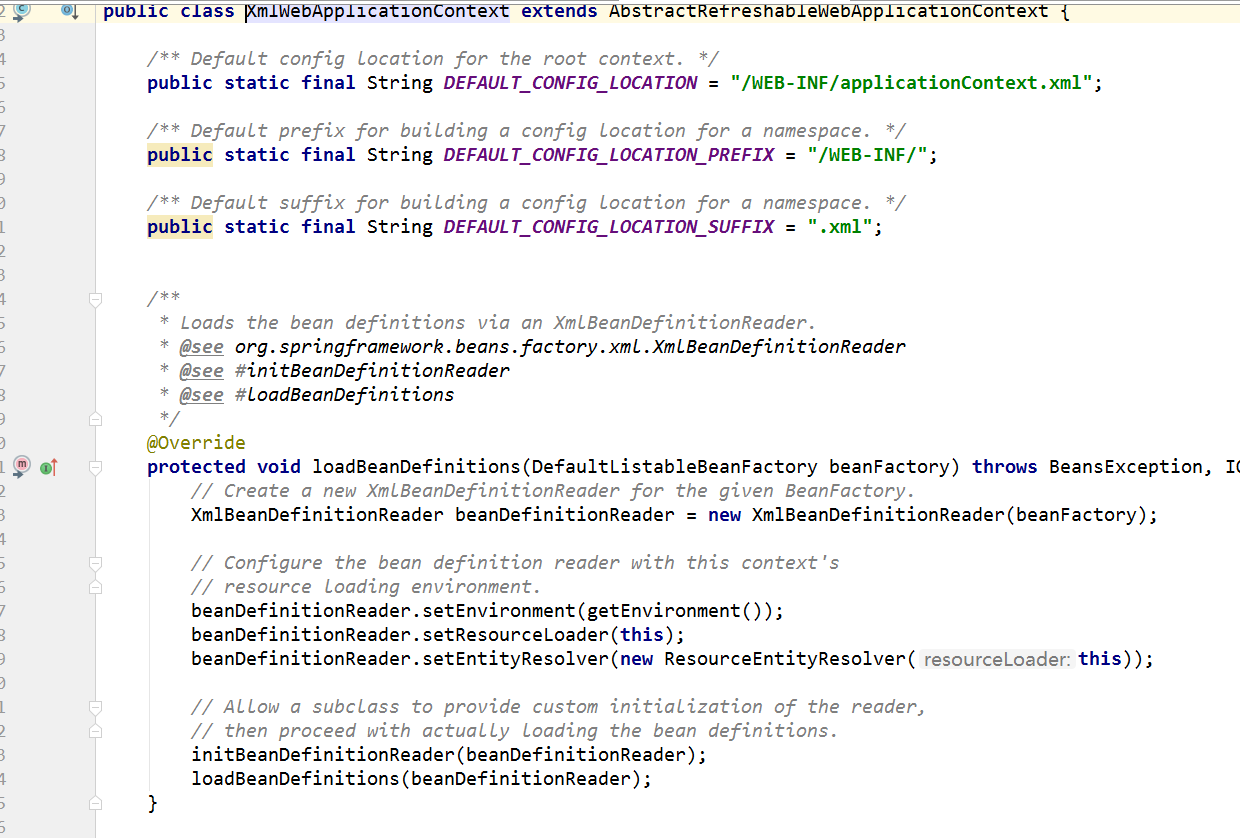 从spring默认使用的XmlWebApplication入手,与IOC容器的初始化过程类似,这个过程也有loadBeanDefinitions方法对BeanDefinition的引入,是通过XmlBeanDefinitionReader 来载入Bean定义信息的,最终完成对上下文的初始化过程