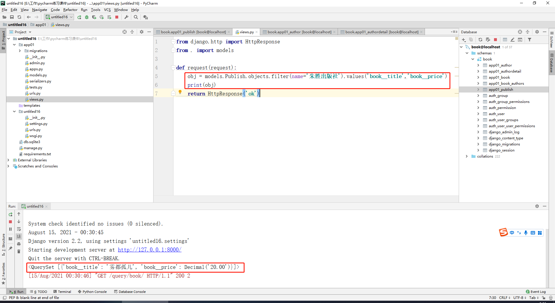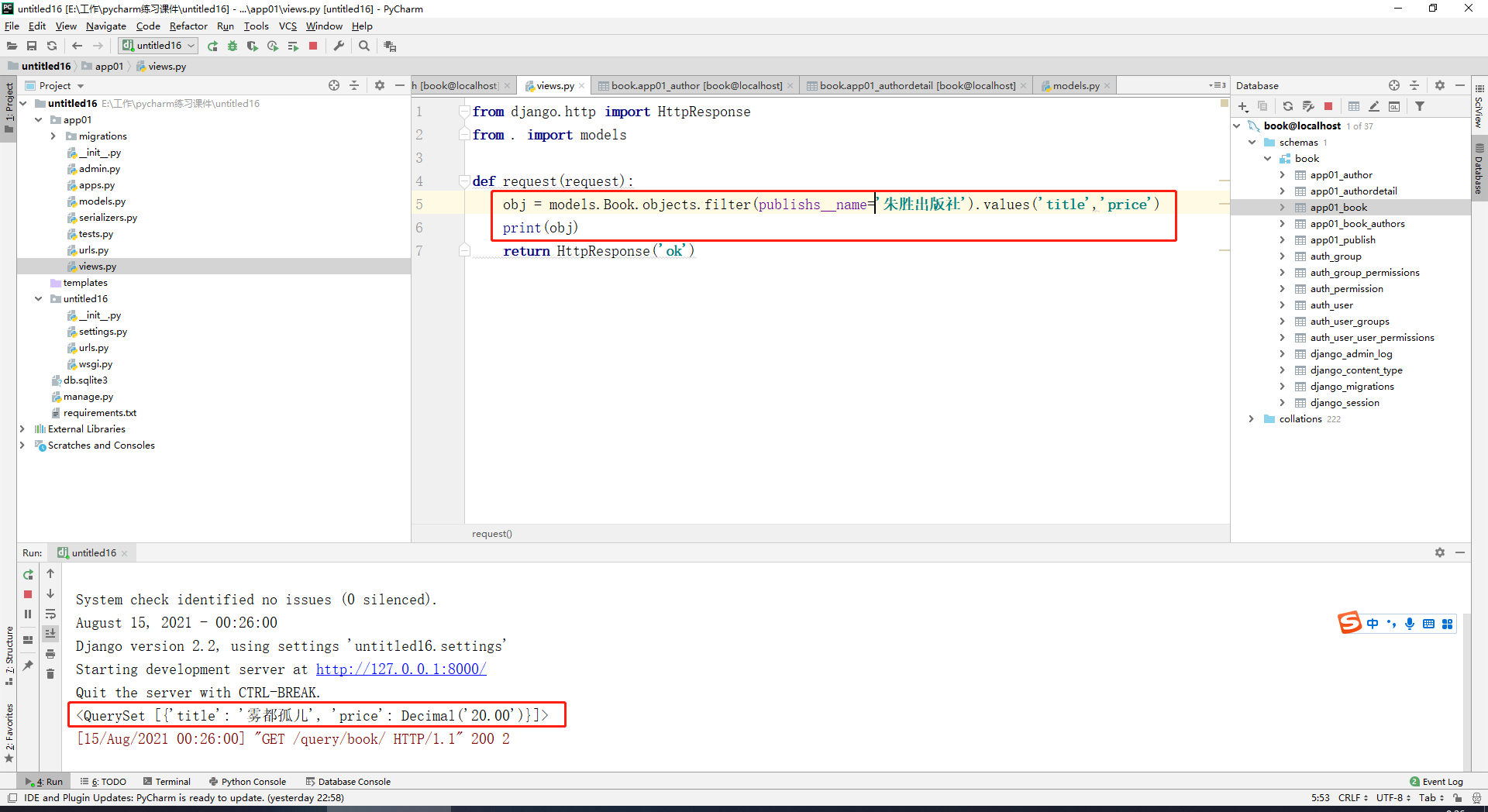 正向查询按字段,反向查询按表名,比如说查询朱胜出版社出版过的所有书籍的名称和价格