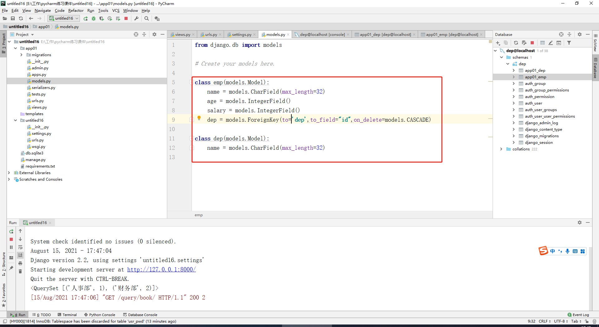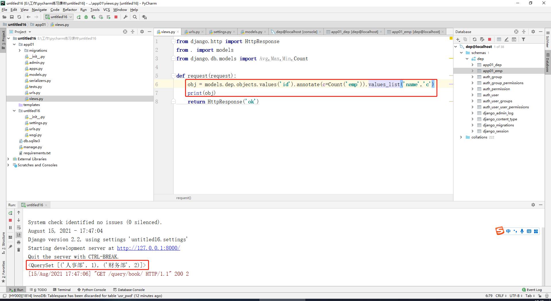 查询每一个部门名称以及对应的员工数,dep表示表,values中的字段表示按照哪个字段group by,annotate里面是显示分组统计的是什么,annotate的返回值是querySet,如果不想遍历对象,可以用上valuelist: